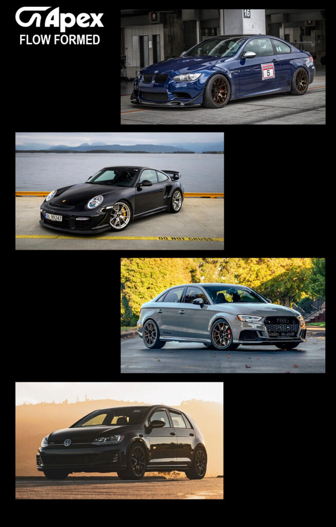 If you have a sports car, and are looking for the best fitment, best value wheel….then APEX Wheels are your choice. Started in 2009, APEX entered the market with a bang, bringing all the right pieces together to meet the needs of both the ENTHUSIAST customer as well as the TRACK customer. They produced a light weight flow formed wheel (offering close to the benefits of a forged wheel – light weight and strength), and yet, at a great value / price. They also spent a lot of time in the design and fitment process, to produce a set of wheels that optimizes the stock fender well spacing to allow you to stuff the biggest, widest wheel / tire combination possible, with great looks.