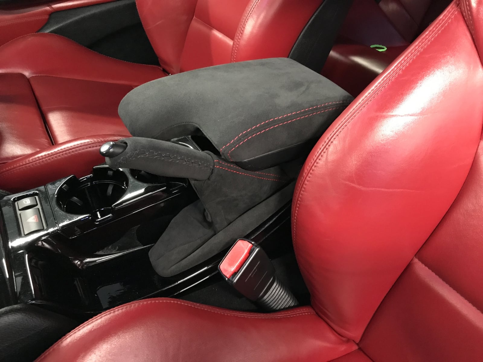 We still had too much red…and it didn’t look completely custom yet, or personalized. We had too much red in the door panels, so we pulled those, had the main section taken out and the arm rest section, and replaced with the same alcantara w red stitching….now we’re getting somewhere.