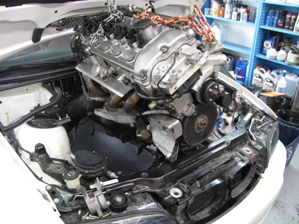 That’s what we did. But, we’ve done them for looks, done them for track…what was to be the goal this time? Just plain FAST / MEAN / QUICK / WICKED….but not for track, just for the street. But, to get there, we needed to do the make over….reinforce the rear subframe, rebuild the engine (main bearings, cams, water pump, thermostat, idler and tensioner, belts, oil pump, clutch, dual mass flywheel, pressure plate….the rest we left alone) and get the base car in shape before we started the project. Then we would do a SuperCharger / Intercooler Kit (VF Engineering kit, the best possible), brakes (Brembo BBK of course, front and rear), APEX large wheels, Michelin tires (larger than stock, near square), suspension (Bilstein PSS10 coil-overs, H&R sway bars, suspension bushings (Powerflex)), exhaust mid-pipe, exhaust rear section, body upgrades (front bumper w CSL type brake ducts, rear Carbon Fiber diffuser), interior trim….and that pretty much covers the base project. There will be more…there is always more.