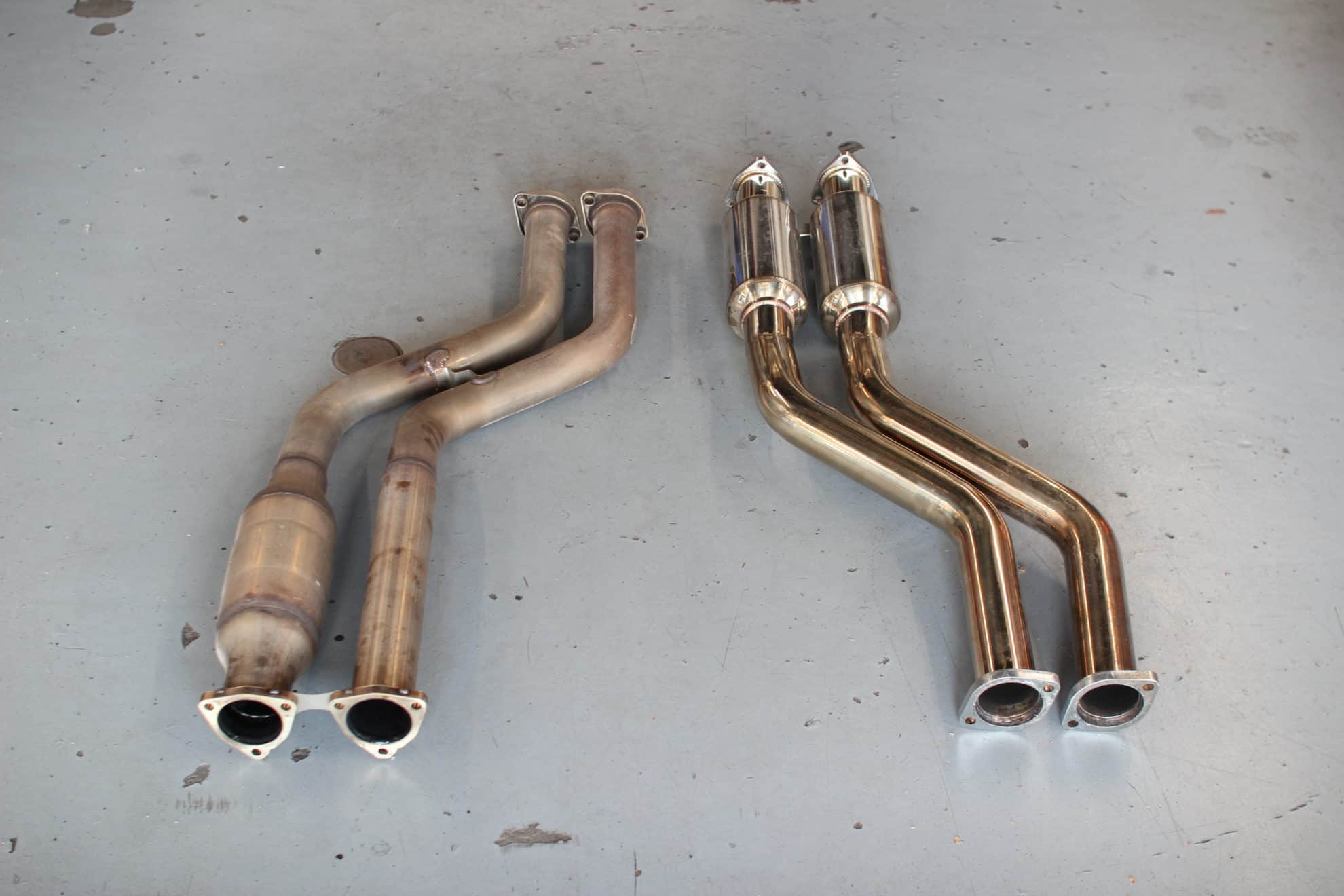 There are three pieces to the exhaust system. Headers (w cats), mid pipe, and rear section. For CA cars, like ours, there is too many issues w trying to do an upgraded header, either w sport cats (catalytic convertors), or without cats…and the power gains are not that significant. The one issue almost all agree with is the drone in the mid-range of the RPM band (right around 2.75-3k RPM, just where the car runs at normal freeway speeds), so we wanted to replace that section to deal w the drone, and choose the Status Gruppe mid-pipe.