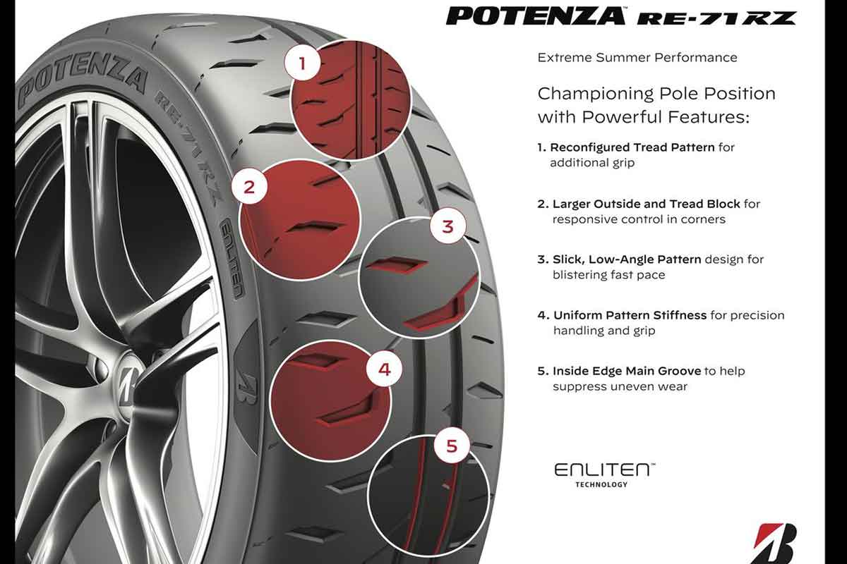 * Faster Track Lap Times: Outpacing the previous generation Potenza RE-71RS tire, the Potenza RE-71RZ tire achieves a .74 second faster dry track lap time and .75 second faster wet track lap time in head-to-head testing on the world-famous Tsukuba Circuit.