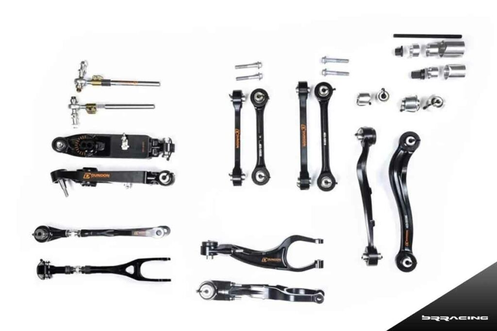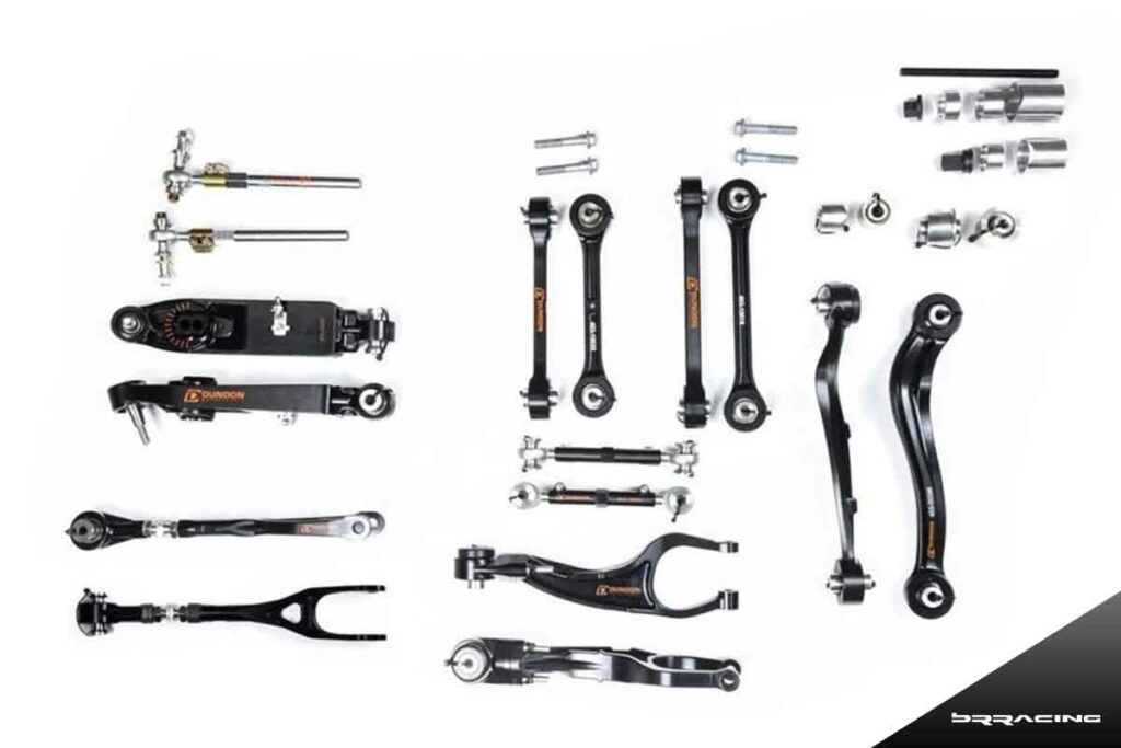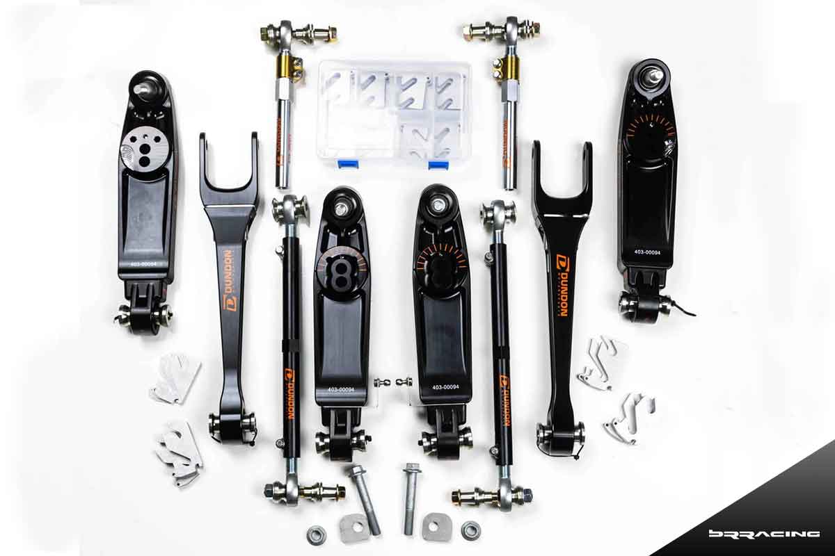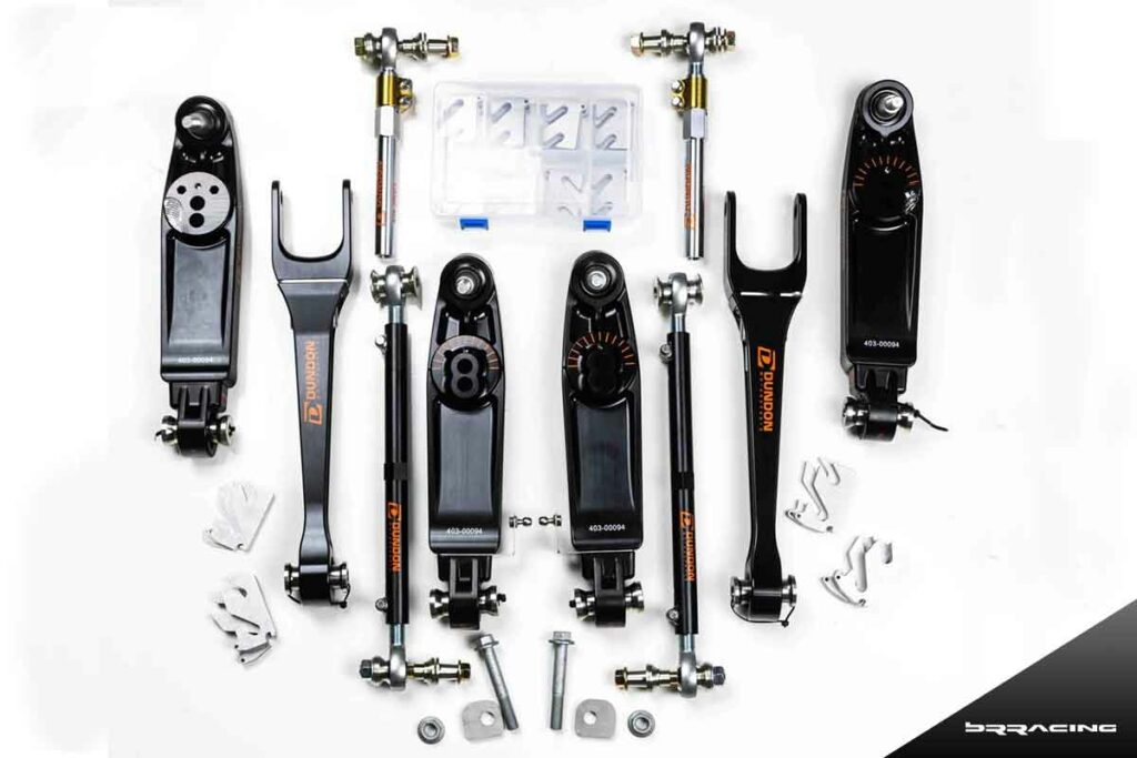 In the “kit” below are front lower adjustable control arms, front adjustable tension strut or thrust arms, front outer steering tie rods (Titanium), rear adjustable toe links, rear adjustable lower control arms, rear camber locking plates…all of the pieces are available separately, and they also package them as front “kits” or rear “kits”.