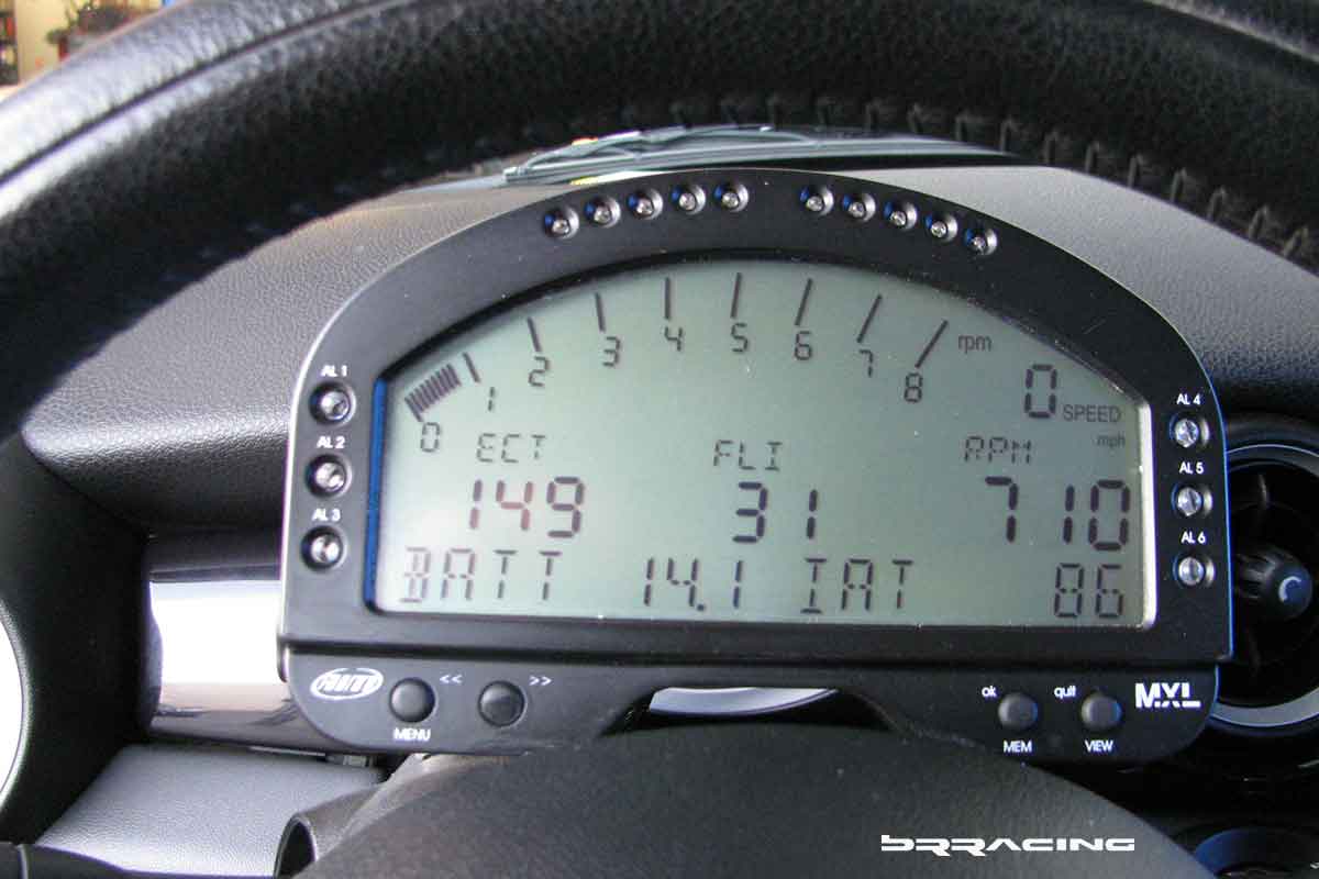 With all the upgrades…we desired to be able to collect data to both set alarms, but also for track driving evaluation. Enter an AIM MXL dash and data logger with custom mount.