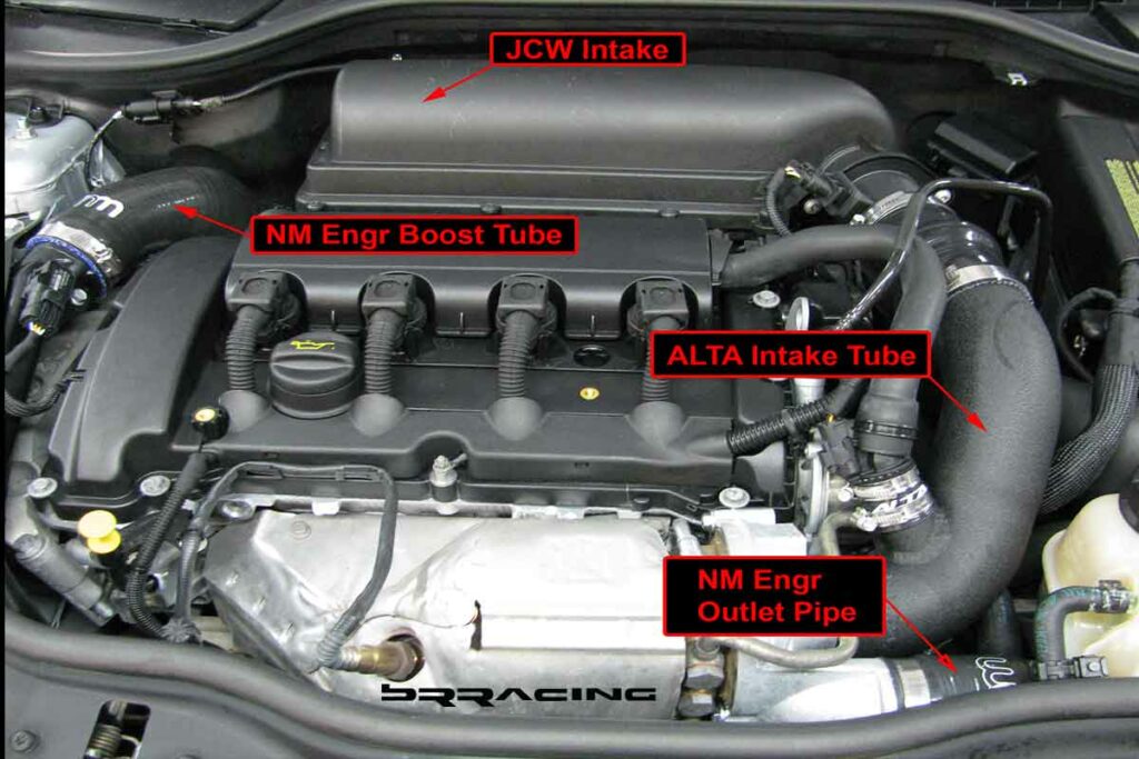 Now, no car would be complete for track duty if we just did the safety aspects. We need some performance to make this car handle and scoot. The easiest upgrade for a MINI Cooper S w the turbo motor is the software upgrade. “We need more power, cap’tn”.?? More power it is! The Cobb system is what we used for this project…and it is as easy as plug and play. Plug into the OBDII port, select your upgrade, and voila, you’re car is transformed. More power, more torque, more get up and go, and more pull when you want it most on the track. You can read in our www and other write ups on the many advantages of this system. If you are going to upgrade the software and turbo power, then we need to feed the engine more, and let it flow better. There we added a new JCW intake, along w upgrade turbo hoses. Now, the car pulls and accelerates and pushes you back in your seat. Get in and hold on.