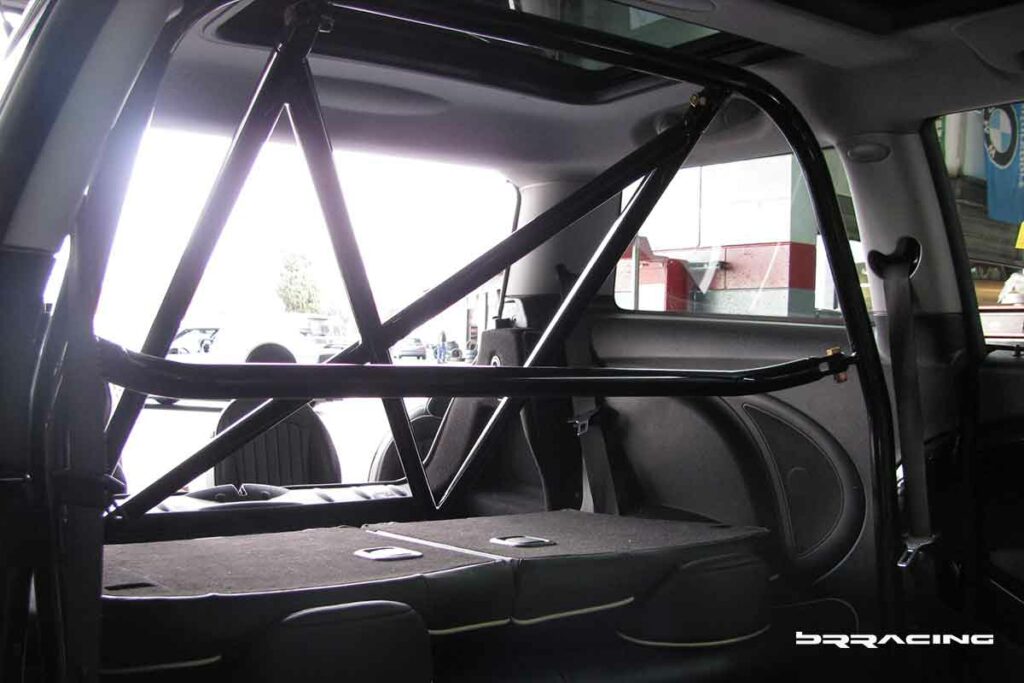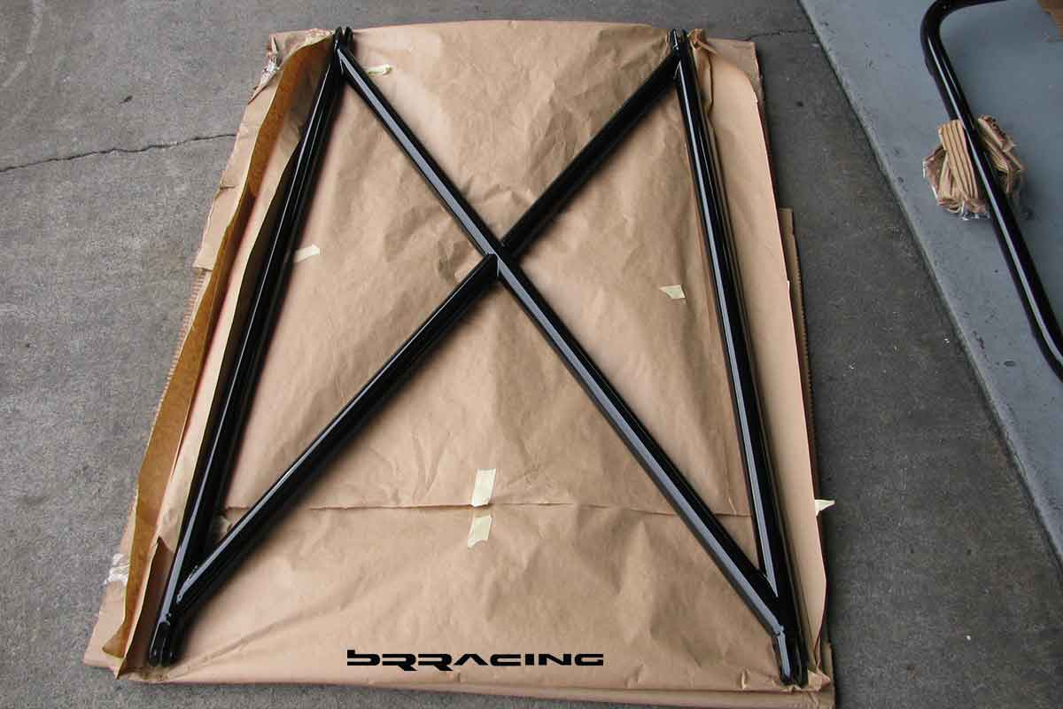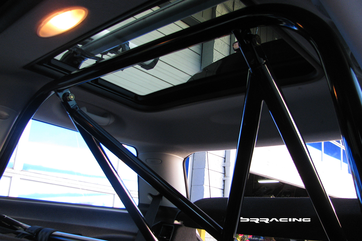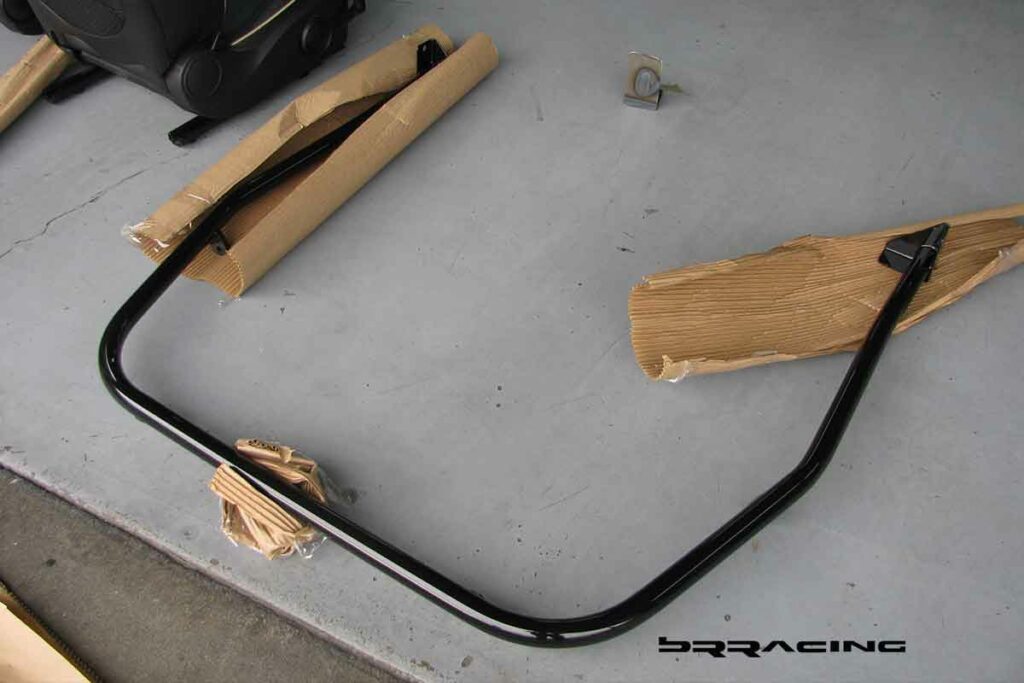 Now, if we can get the car to stand on its nose under braking….we need some way to keep us planted in our seats or we will become like the bug, and a smear on the front windshield. There are SO MANY reasons to deal with seats, harnesses, and a harness bar. SAFETY is the number 1 reason, but there are many more. We find that in every track upgrade…when we upgrade the seats and harnesses, and can keep the driver focused on driving, and not holding themselves into position while trying to corner or turn…that their lap times drop by about 2 seconds or more. Most customers think of so many other things first to get their car to go faster…when they need to focus on themselves, and getting them into an environment that allows them to go faster. They are more comfortable, planted, relaxed, and they can focus and enjoy the whole driving experience. Most cars without these upgrades, have drivers who come home from a DE event with bruises on their knees and legs, and find their arms hurting from the strain. Not what we want at all. And….if we’re going to put those safety features in, we need a proper way to secure the whole system…and this is where the harness bar / roll bar come into play. The main reason for this is SAFETY….you can NOT cheap out on SAFETY….if you are going to do DE events, then this is the NUMBER 1 priority. PERIOD…no questions, no maybe. You have to invest here. This car and owner did, and purchased the BRracing complete harness / roll bar solution. Just like any well designed system, there are many benefits. Safety, added strength and rigidity for the car, proper harness attachment. Our system also allows the horizontal harness bar and rear down / X brace to be removed so that if the car needs use of the rear seats, you can. Our system also attaches to all OEM attachment points, so that no new holes or welding points or fabrication is needed. Here is the bar in the stages of installation.