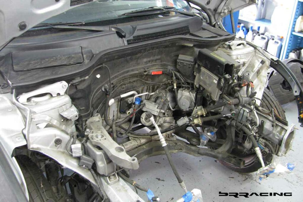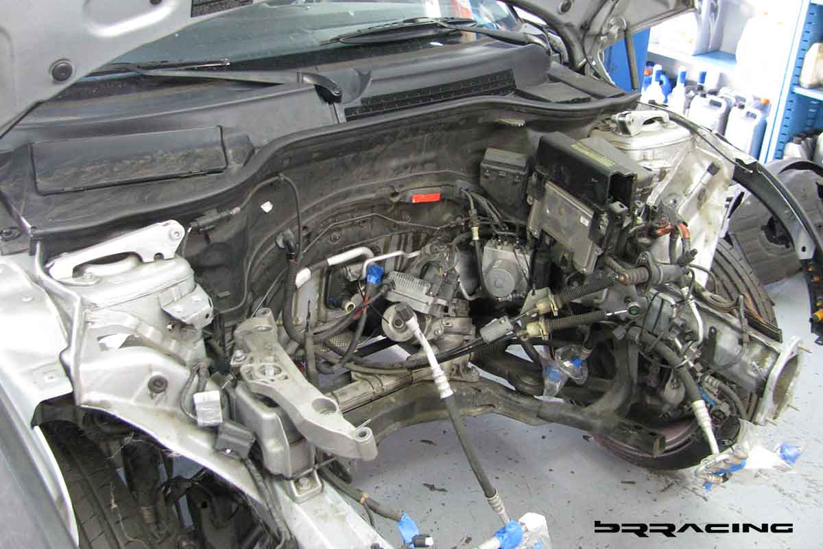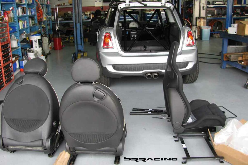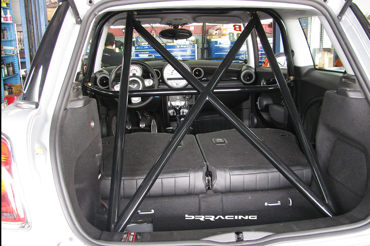 Now, if we can get the car to stand on its nose under braking….we need some way to keep us planted in our seats or we will become like the bug, and a smear on the front windshield. There are SO MANY reasons to deal with seats, harnesses, and a harness bar. SAFETY is the number 1 reason, but there are many more. We find that in every track upgrade…when we upgrade the seats and harnesses, and can keep the driver focused on driving, and not holding themselves into position while trying to corner or turn…that their lap times drop by about 2 seconds or more. Most customers think of so many other things first to get their car to go faster…when they need to focus on themselves, and getting them into an environment that allows them to go faster. They are more comfortable, planted, relaxed, and they can focus and enjoy the whole driving experience. Most cars without these upgrades, have drivers who come home from a DE event with bruises on their knees and legs, and find their arms hurting from the strain. Not what we want at all. And….if we’re going to put those safety features in, we need a proper way to secure the whole system…and this is where the harness bar / roll bar come into play. The main reason for this is SAFETY….you can NOT cheap out on SAFETY….if you are going to do DE events, then this is the NUMBER 1 priority. PERIOD…no questions, no maybe. You have to invest here. This car and owner did, and purchased the BRracing complete harness / roll bar solution. Just like any well designed system, there are many benefits. Safety, added strength and rigidity for the car, proper harness attachment. Our system also allows the horizontal harness bar and rear down / X brace to be removed so that if the car needs use of the rear seats, you can. Our system also attaches to all OEM attachment points, so that no new holes or welding points or fabrication is needed. Here is the bar in the stages of installation.