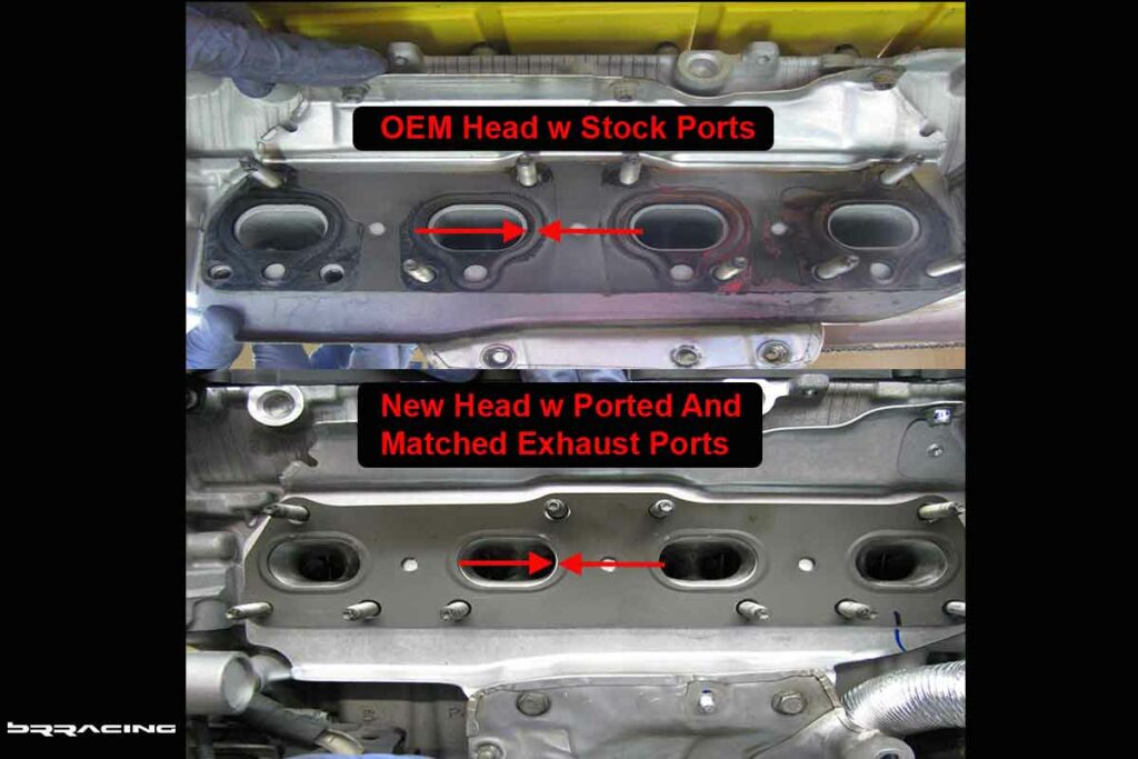 In the above picture, you can see the new exhaust manifold gasket. This engine / car was a 2007 MINI Cooper R56 MINI Cooper S…but, there is a JCW version now. We know the JCW engine uses a larger exhaust manifold, to feed the turbo better, and also utilizes a larger turbo..work needed to be done to properly match all the elements together. Here you can see the additional “porting” done to the exhaust head ports, and exhaust manifold gasket (port matching).