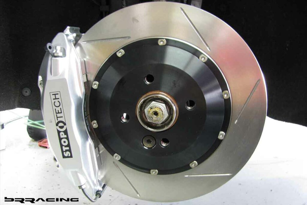 Finally, as most know, the top of the braking food chain is the Brembo system. Brembo makes a great braking system, and the one for the MINI (front only, and that is all your really need) fits well in a slighlty wider array of MINI 18″ wheel options. This system too is a complete BBK…floating 2 piece rotor, big, strong caliper, bigger pads, longer moment arm for center of pressure…everything you need in a BBK. Its just the price that is a little higher. Large selection of pads, from street/performance to full race options. This project MINI, due to the choice of wheels and the desire for the best braking system, received the StopTech BBK upgrade. To make most wheels fit (these wheels have an offset of ET40, will require a 5mm spacer). Awesome system (this MINI gets the StopTech ST40 front BBK kit) –
