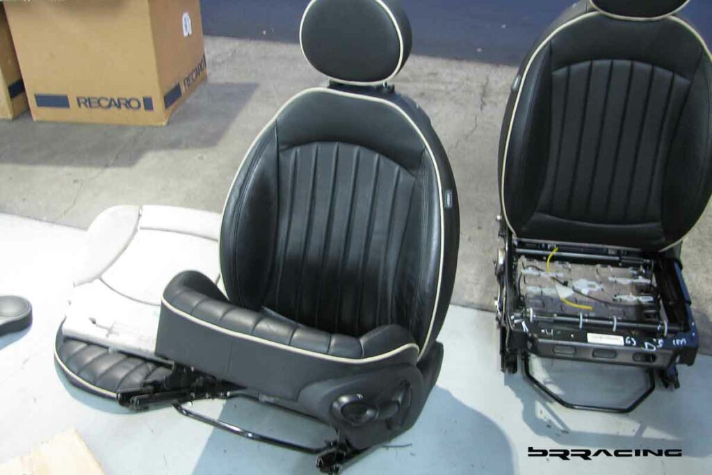 For the seat occupancy sensor….you need to take the old seat, the OEM seat, completely apart. With the seat out of the car, you can then remove the lower seat cushion. Once the the cushion is out, you can then take it apart, and remove the outer leather covering from the base cushion. When you get this off, you will then have access to the electronic seat occupancy sensor and wiring harness. Take the sensor and harness out. Take the new Recaro seat, and take it apart in the same manner. Take the lower seat cushion off the seat frame, take the fabric covering off the lower seat cushion, and install the OEM seat occupancy sensor. Re-install the fabric covering on the cushion, install the cushion into the seat frame, and now the seat is ready for installation into the car. Simple….right???? Test the voltage and resistance drop of the seat sensor before installing, and you are good to go.